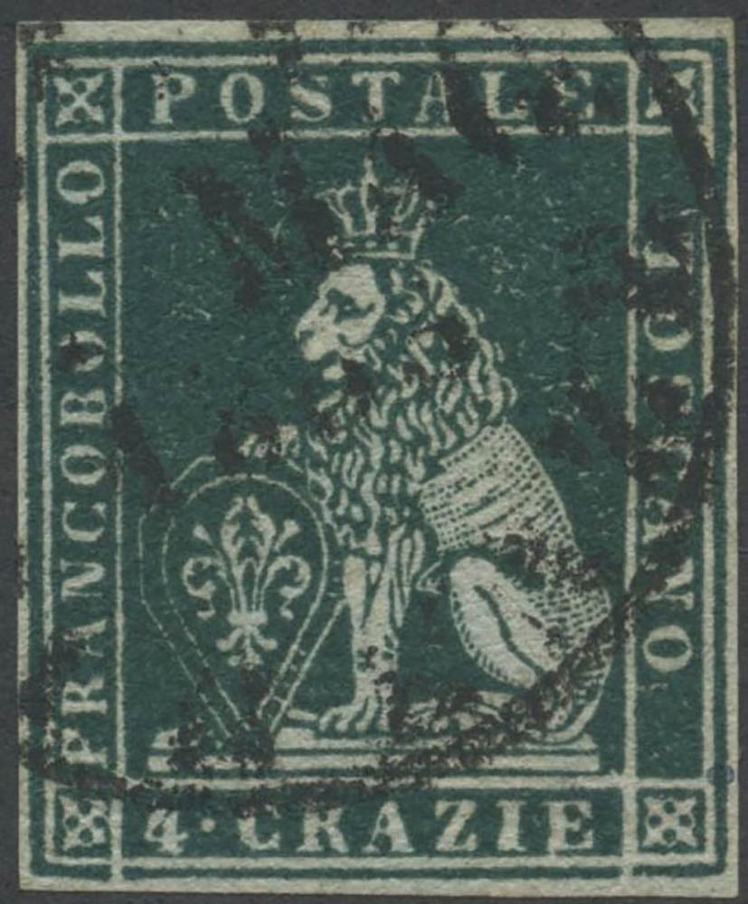 1851, 4cr. N. 6b Verde Scuro su Azzurro, usato. Tonaità particolarmente intensa. (Lux) (Cat.550)