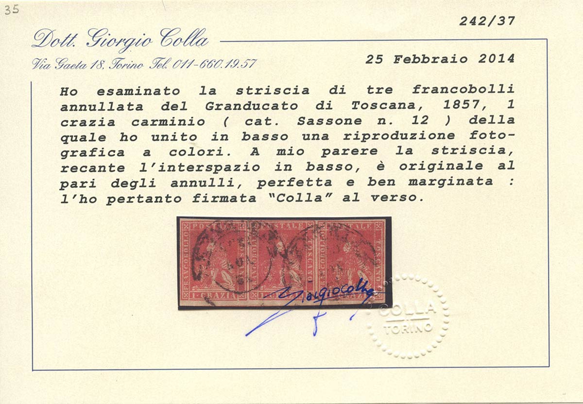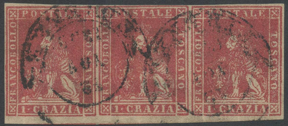Lot 303 | 1857, 1cr. N.12 Carminio in striscia di tre, interspazio di gruppo in basso....