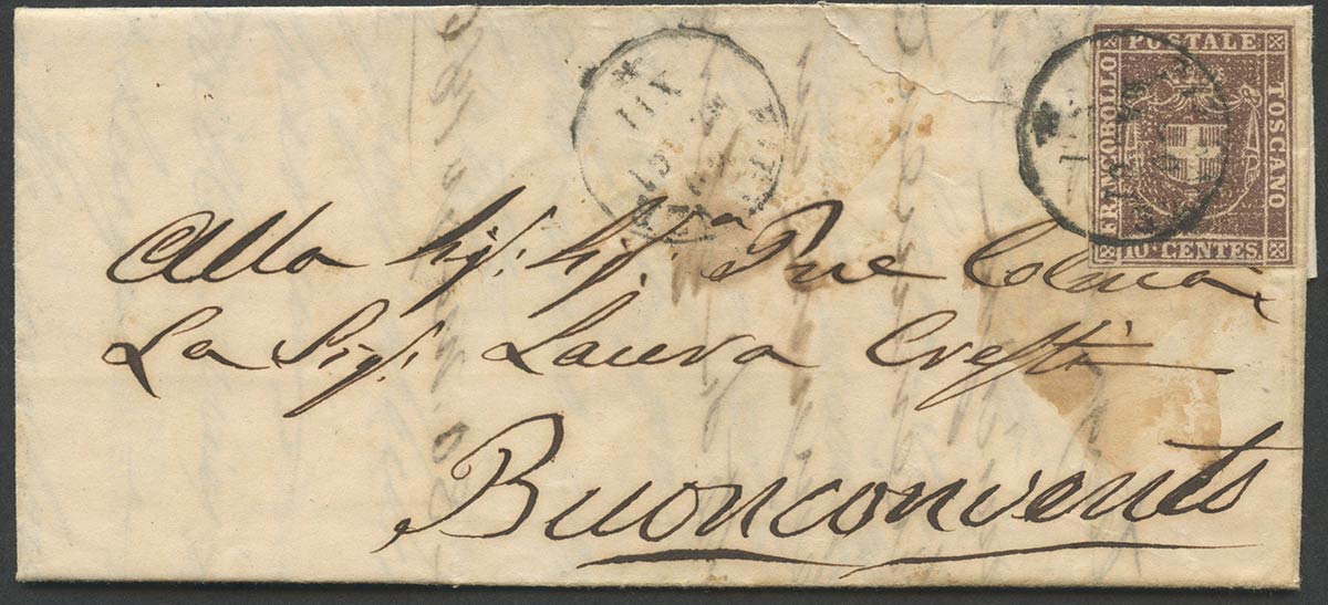 Due interessanti lettere di toscana, Una da Marciana Marina per Napoli con al retro l'annullo 'transito per lo stato pontificio'' affrancata per 3cr. Tramite 1cr N.4d Carminio su Grigio, 2cr. N.5 Azzurro Chiaro su Grigio. La seconda lettera da Pisa per Buonconvento affrancata con un 10c. del G.P., non comune l'utilizzato durante il regno d'italia. Qualità mista.