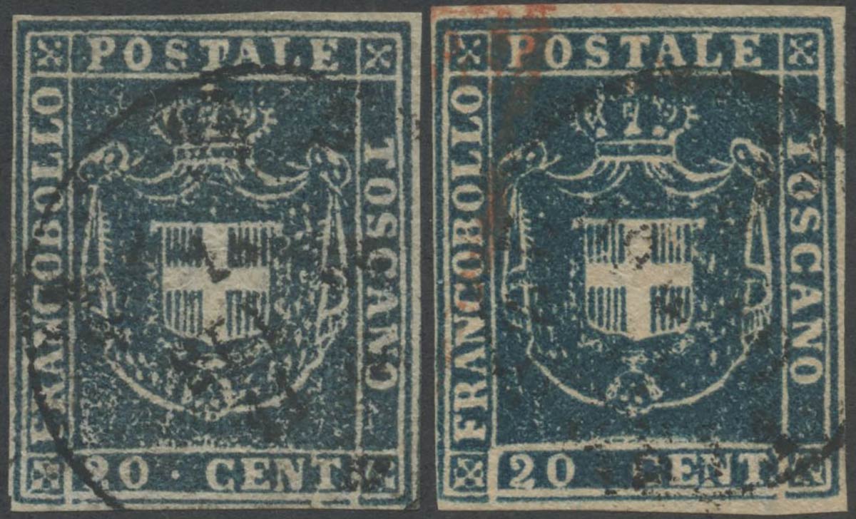 1860, 20c. N.20 in due diverse gradazioni di colore. (A+) (Cat.600++)