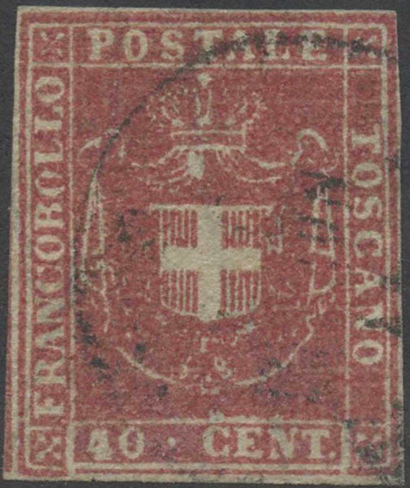 Previous Lot 326 Next Bertolami Fine Art - Piazza Lovatelli 1, 00186 Roma WEB AUCTION 104 - FILATELIA Filatelia Thursday 30 September 2021 hours 14:00 (UTC +01:00) 1860, 40c. N.21 Carminio, usato. (A) (Cat.600) 1860, 40c. N.21 Carminio, usato. (A) (Cat.600)