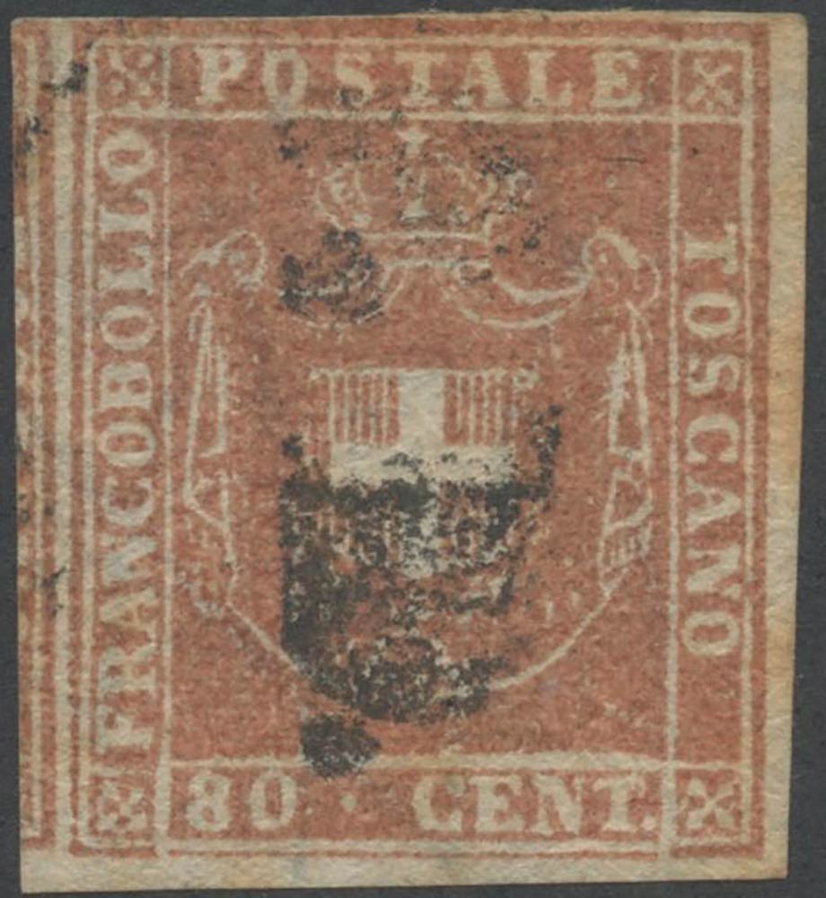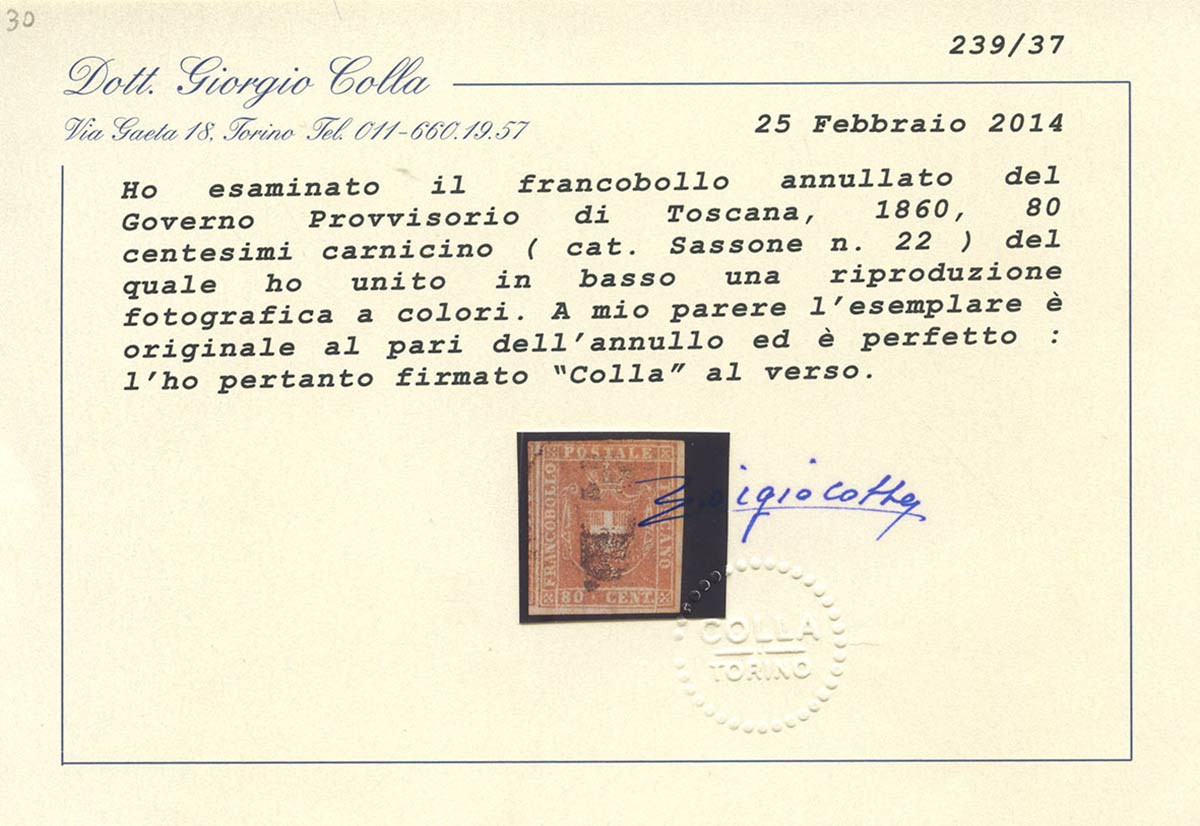 1860, 80c. N.22 Carmicino, usato. (A-) (Cert. Colla) (Cat.2.250)