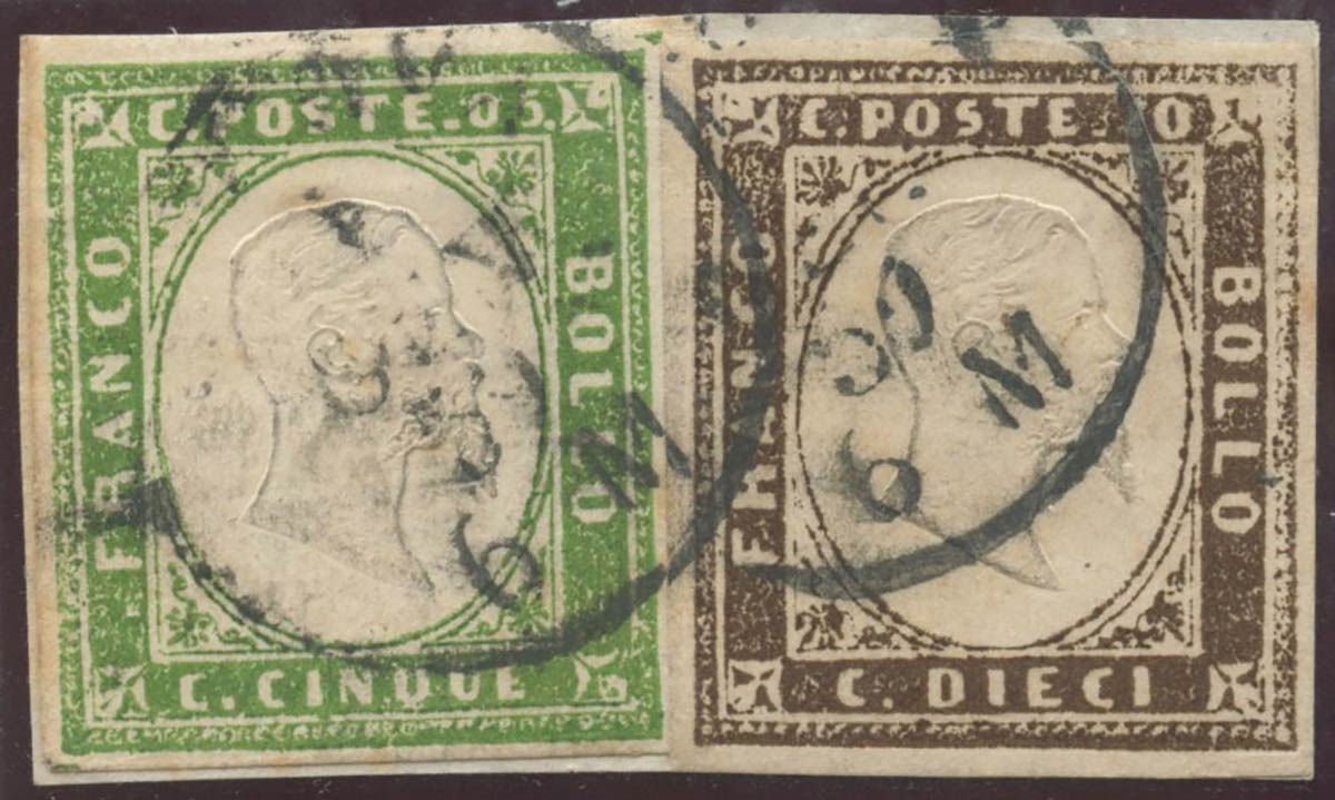 1859, Frammento bicolore composto da 5c. N.13Ad e 10c. N.14c Terra D'ombra...