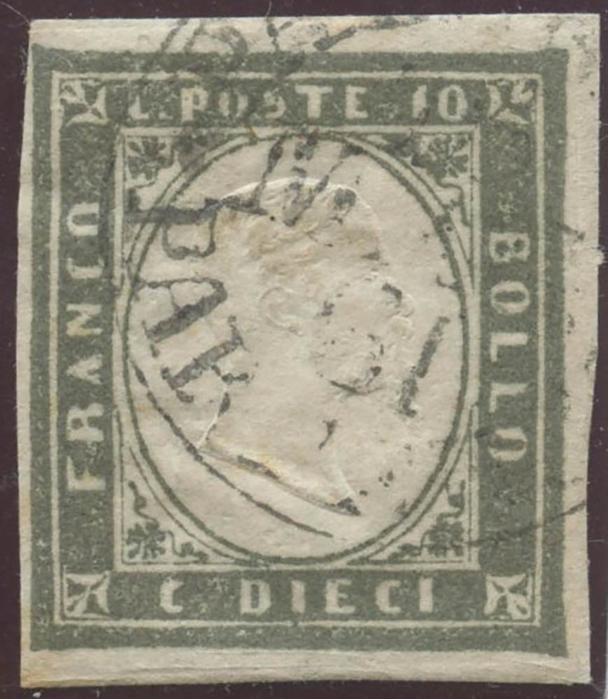 1861, 10c. N.14Caa Oliva Grigiastro Verdastro, tonalità carica al confine con il 14Cba, usato. (A+) (1.200++)