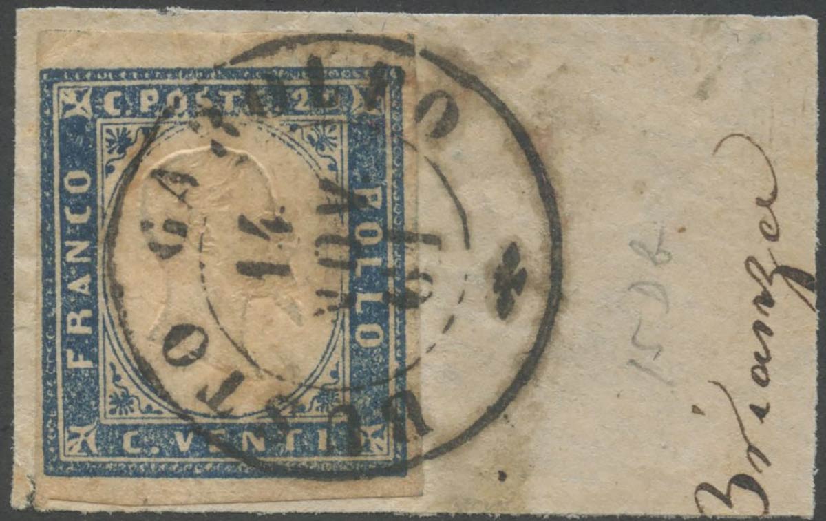 1861, 20c. N.15Dc Azzurro oltremare (chiaro) annullato con il doppio cerchio di Busto Garolfo(11pt) su frammento. (A) (Cat.1125)