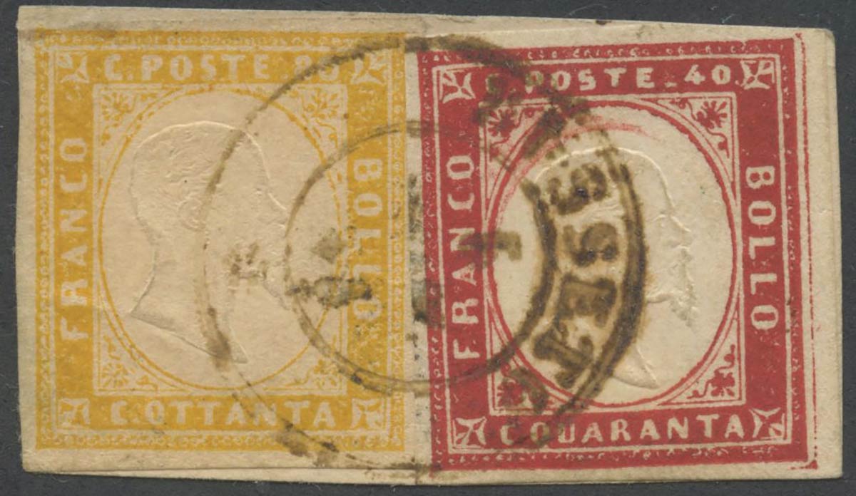 Lot 390 | Frammento composto da 40c. N.16D Rosso Carminio, 80c. N.17B Giallo Arancio...