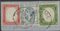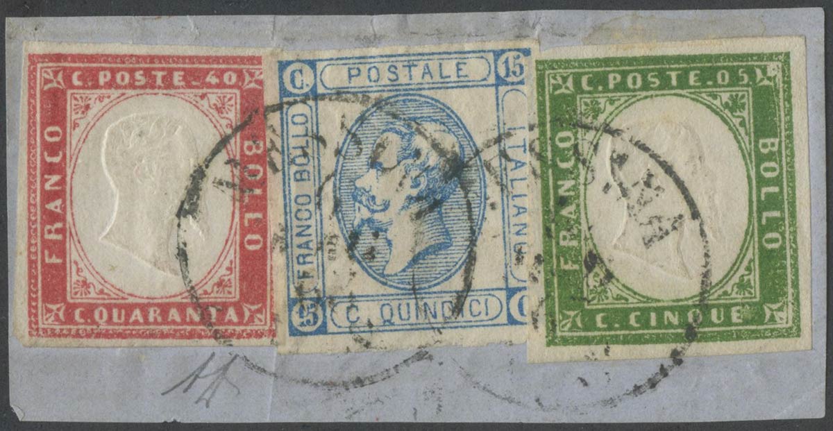Frammento ''Patriottico'' tricolore misto Sardegna/Regno composto da 40c. N.16Eb Rosa Carminio Lillaceo, 15c. N.12 Azzurro e un 5c. N.13Da Verde Giallastro. (A+) (A. Diena, Raybaudi) (Cat.--)