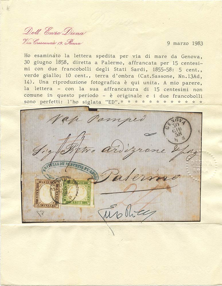30.06.1858, Lettera spedita per via di mare da Genova per Palermo affrancata per 15c. Tramite un 5c. N.13Ad Verde Giallo e un 10c. N.14 Terra D'ombra. (A) (Cert. En. Diena) (Cat.3.300++)
