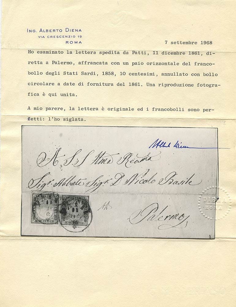 11.07.61, Lettera da Patti per palermo affrancata con una coppia di 10c. N. 14Caa. ((A-/B) (Cert.A. Diena) (Cat.10.500)