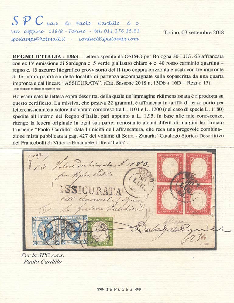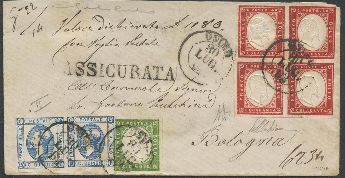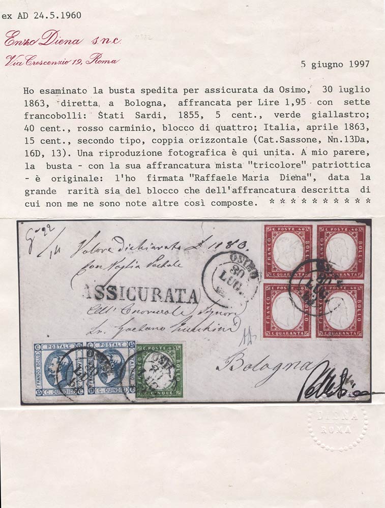 Lettera assicurata da Osimo a Bologrna con affrancatura mista composta da Sardegna 5c. Verde Giallastro N.13Db + Quartina del 40c. Rosso Carminio 16D + Regno coppia 15c. Azzurro II tipo N.13. Lettera pubblicata sul Serra-Zanaria a pag.427. (B) (A.Diena, Cert. Cardillo, Cert. E.Diena) (Cat. 120.000++)
