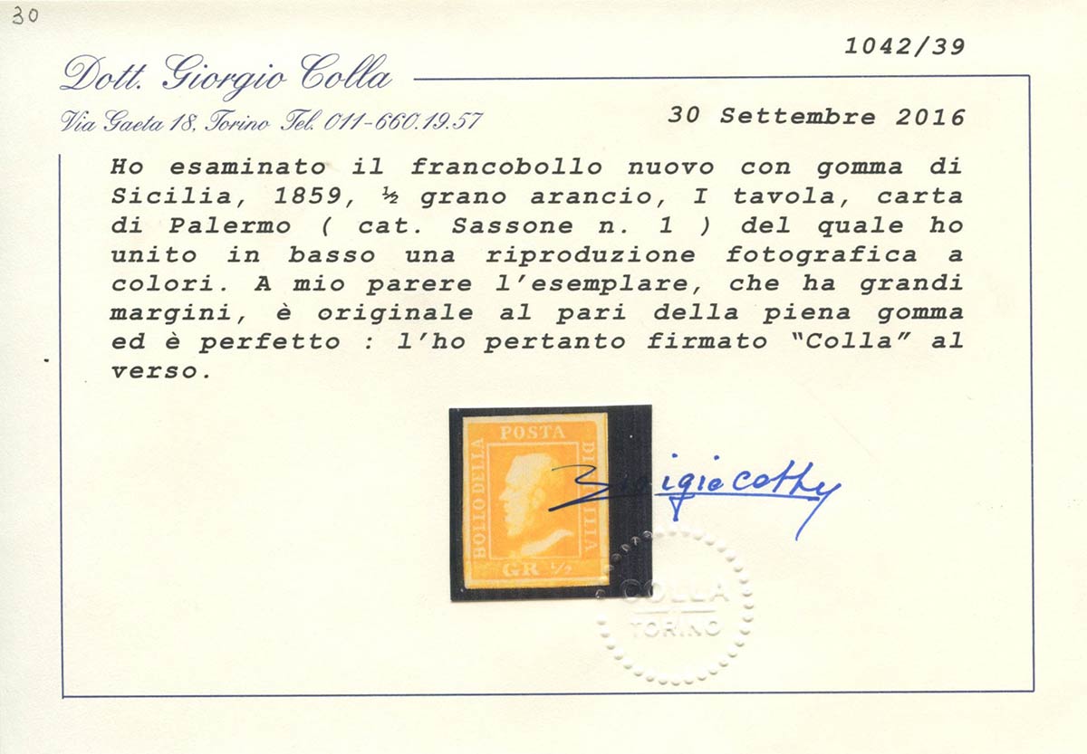 1859, 1/2gr. Arancio (I tav) nuovo con gomma, linguellato (A+) (E. Diena, A. Diena, En. Diena, cert. Colla) (Cat.1.200)