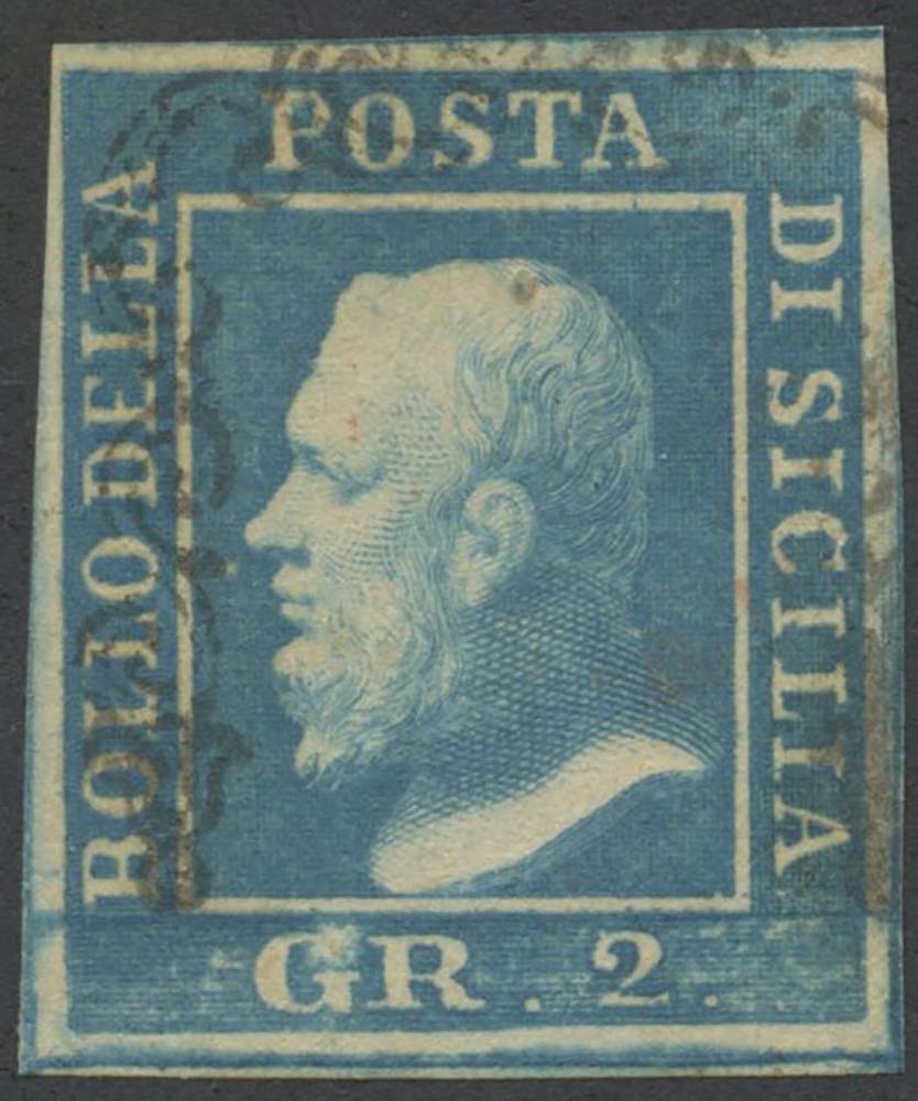 1859, 2gr. N.7a Azzurro (II tav), usato. (A+) (Chiavarello, A. Diena) (Cat.275)