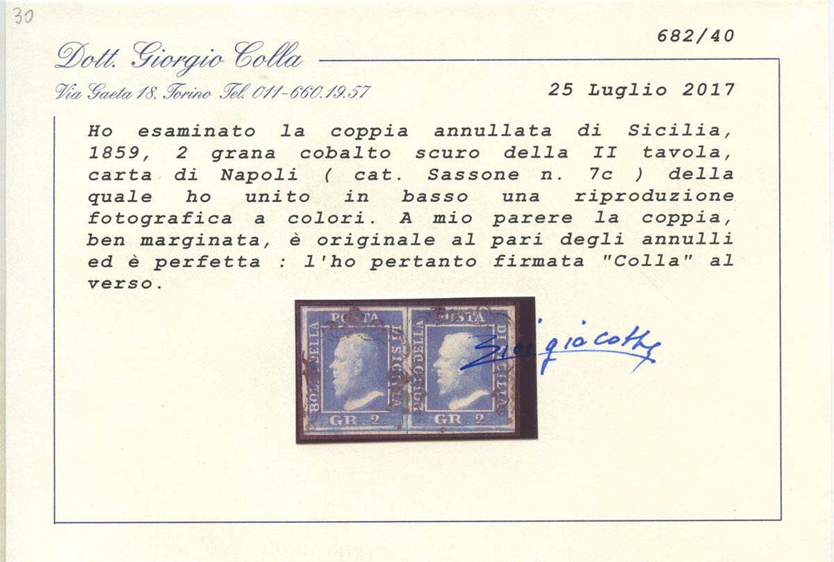 1859, 2gr. N.7c Cobalto Scuro (II tav), coppia in un'interessantissima nuance, usata. (Lux) (cert.Colla) (2.000++)