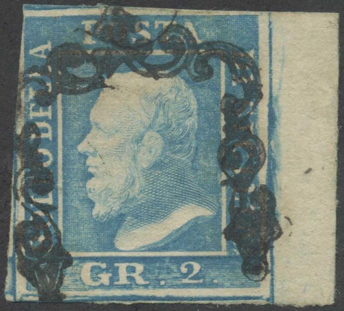 1859, 2gr N.8 Azzurro Chiaro (III tav) bordo di foglio a destra, usato. Margine sinistro da grande a completo. (A+) (Sorani) (Cat.220++)