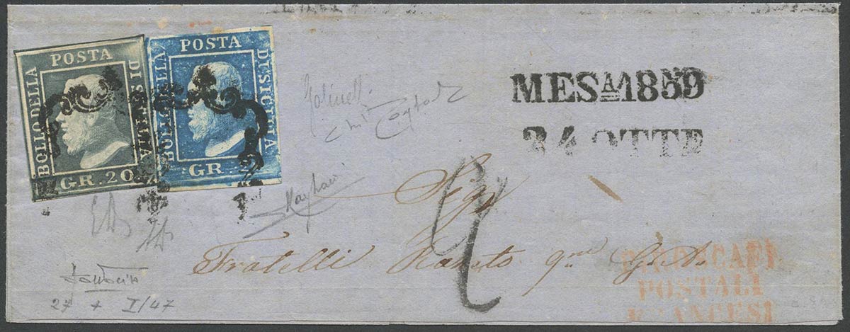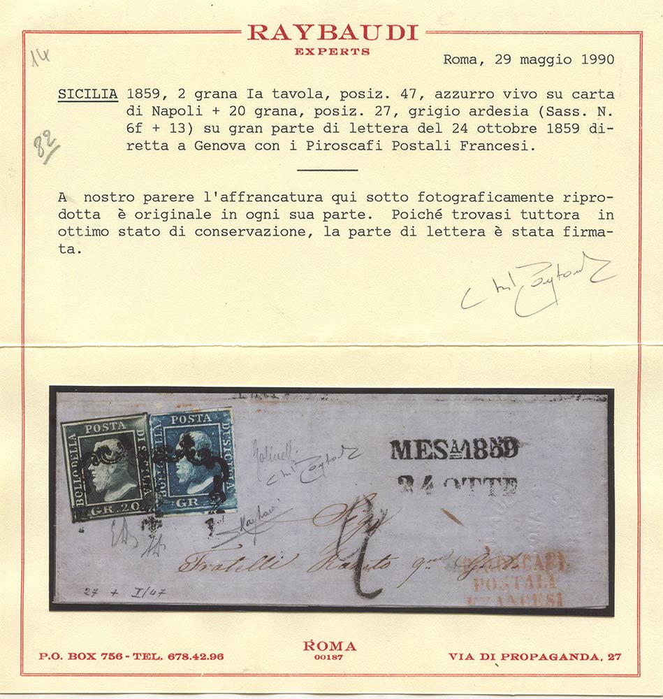 Sicilia- Gran parte di lettera affrancata con 20gr. N.13 Grigio Ardesia (pos.27) e 2gr. N.6f Azzurro Vivo (pos.47 I tav.) (A+). (E. Diena, A.Diena, Sottoriva, Raybaudi, Golinelli, Cert Raybaudi) (Cat. Circa 4.500 per il frontespizio)