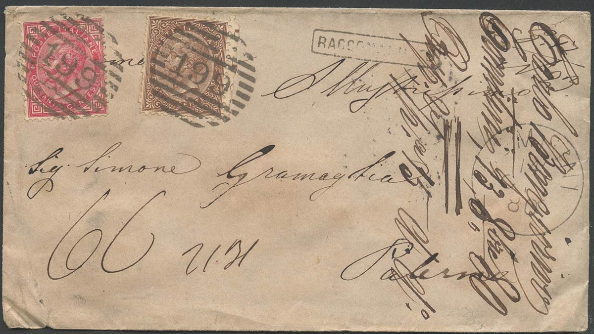 14.10.1880, lettera raccomandata da Comitini per Palermo affrancata con 30c. Bruno Castano N.T19+ 40c. Rosso Carminio N.T20. (A) (Cat.--)