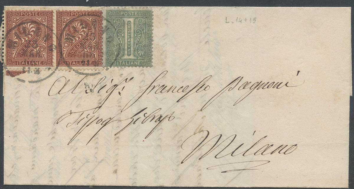 23.03.1866, Lettera da Milano per Città, affrancata con una coppia del 2c. Bruno Rosso N.L15 + 1c. Verde Grigio chiaro N.L14. (A) (Cat.1.060)