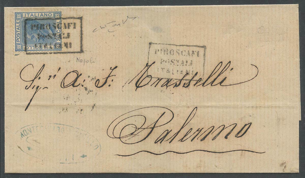 Lettera da Napoli per Palerno affrancata con 20c. N.T26 annullato con timbro in cartella ''Piroscafi postali Italiani''