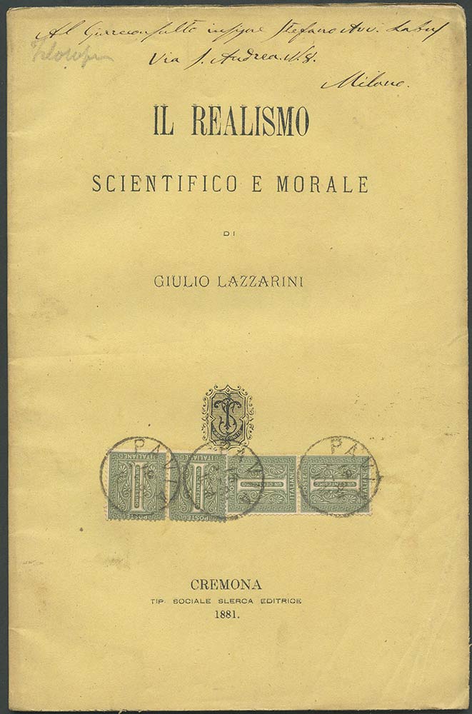 Rivista ''Il Realismo'' Spedita da Pavia a Milano affrancata con 4 esemplari da 1c. N.T14. Documento perfettamente conservato ed integro, al retro il timbro di arrivo a Milano. (A+) (Cat.--)