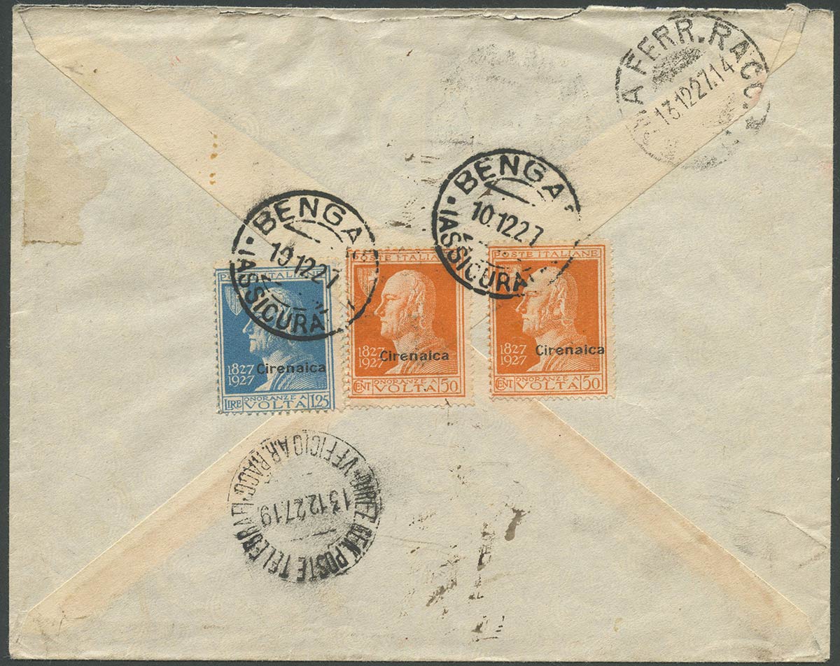 Cirenaica, Lettera da Bengasi a Roma affrancata con due esemplari del 50c. Arancio N.43 + 1,25L. Azzurro N.44