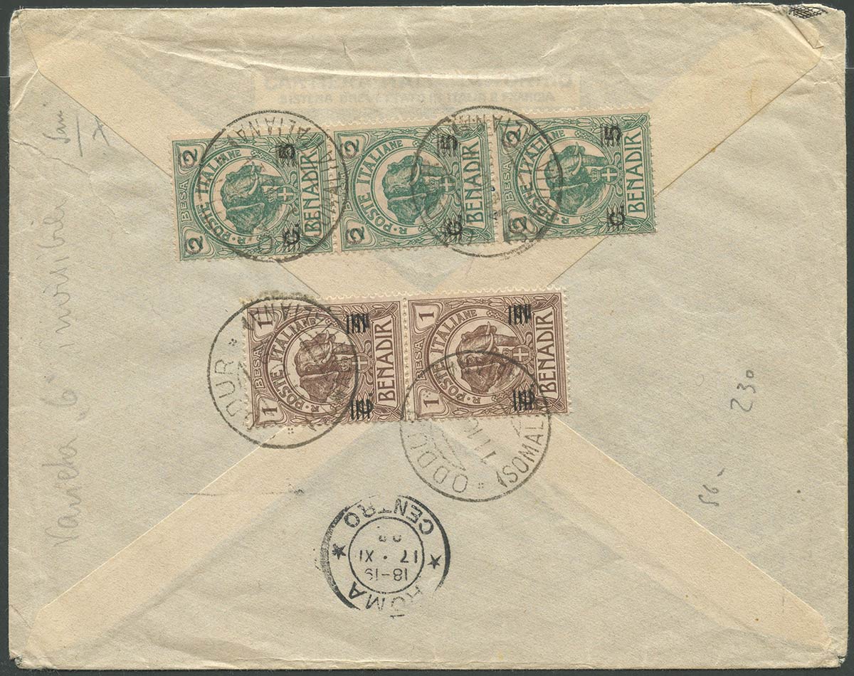 Somalia, lettera da Oddur a Roma affrancata con due esemplari del # su 2c. Su 1b + una striscia di tre del 6b su 5c. Su 2b. N.34 N.38.