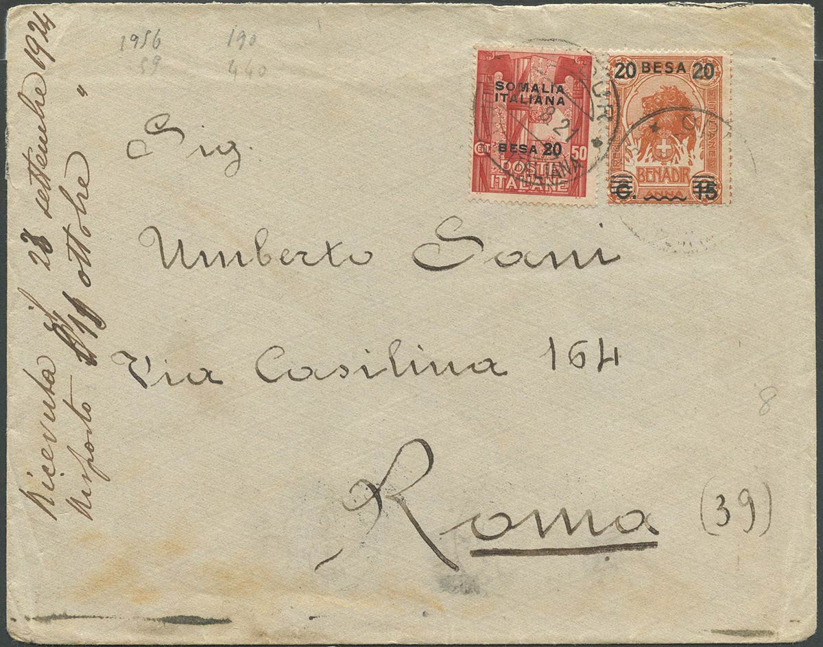 Somalia, Lettera da Oddur a Roma affrancata con 20b. Su 15c. Su 2a.+ 20b. Su...