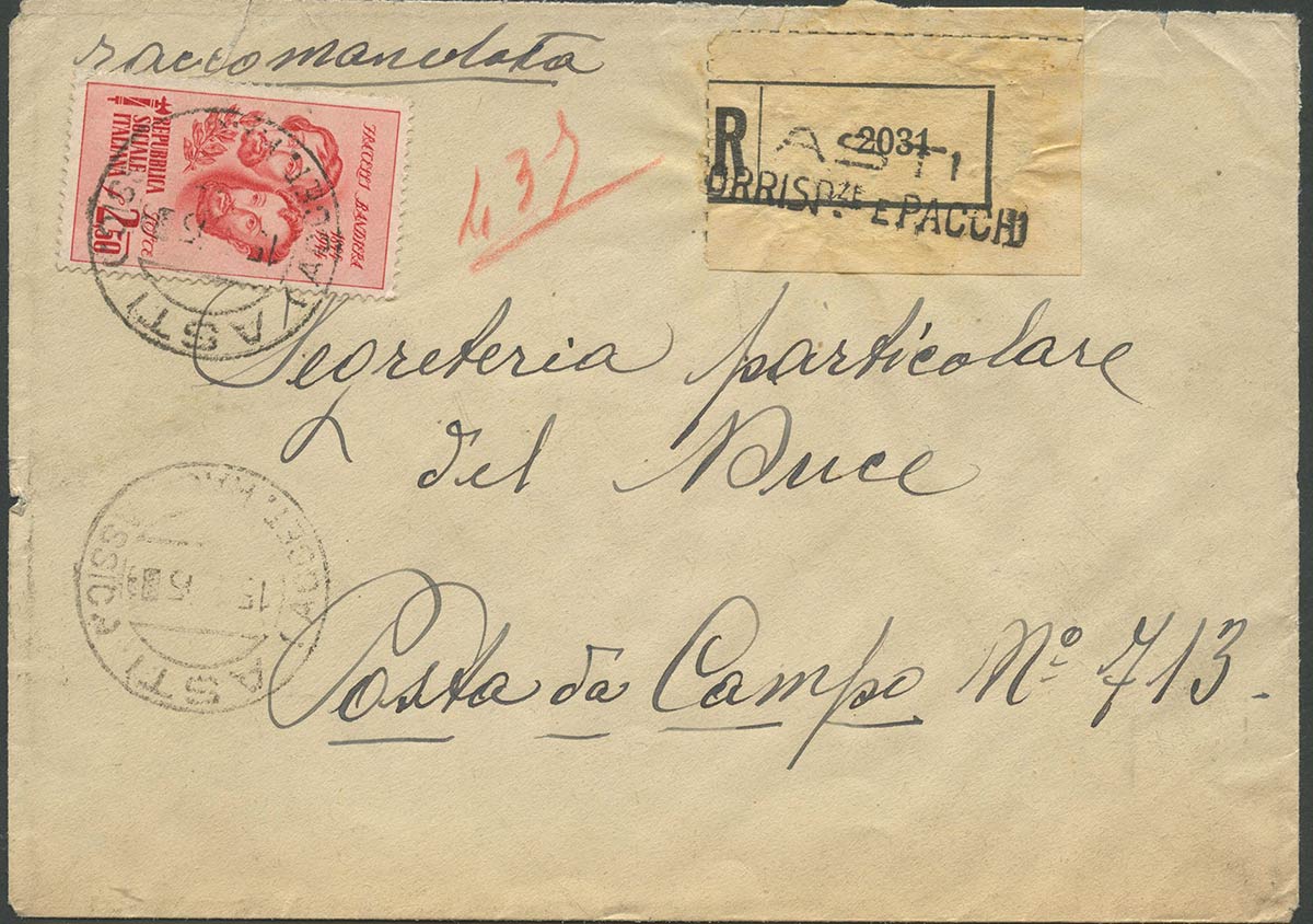 Lettera Raccomandata da Asti a Posta da Campo N.713 affrancata con 2,50L. 514.