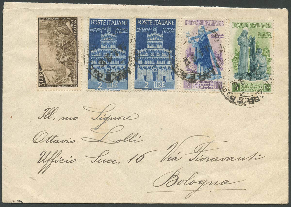 Lettera Faenza a Bologna del 12 Gen 1949 in tariffa di 15L. Composta da S. Caterina 3L. N.574 + 5L. 575, Risorgimento 3L N.580, Av. Repubblica 2L. N.567 x2