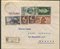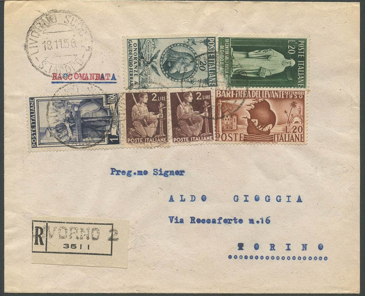 Lettera raccomandata del 18 Nov 1950 in tariffa da 65L. (20L. + 45L. per la raccomandazione) composta da ''Democratica'' 2L N.552 x2, ''Gaudenzo Ferrari'' 20L N.622, ''Guido D'Arezzo'' 20L N.626, ''Fiera di Levante'' 20L N.627, ''Italia al lavoto'' 1L N.635.