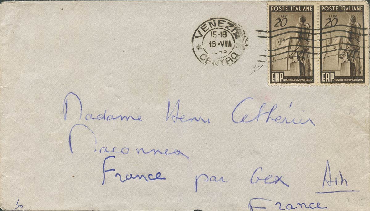 Lettera da Venezia a Gex (Francia) Affrancata per 40L., per il primo porto delle lettere semplici per l'estero, con due esemplari da 20L. Della serie ''P. di Ricostruzione dell'Europa'' N.603. Al retro non è visibile il timbro di arrivo. (Chiavarello)