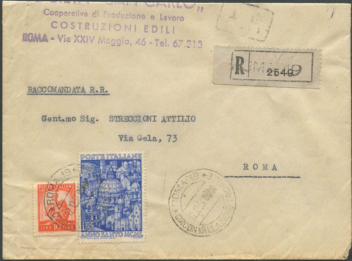 Lettera Raccomandata Da Roma per Città del 12 Dic 1950 in Tariffa da 65L. (20L. + 45L. per la raccomandazione) con affrancatura composta da ''Democratica 10L. N.559, ''Anno Santo'' 55L. N.621.