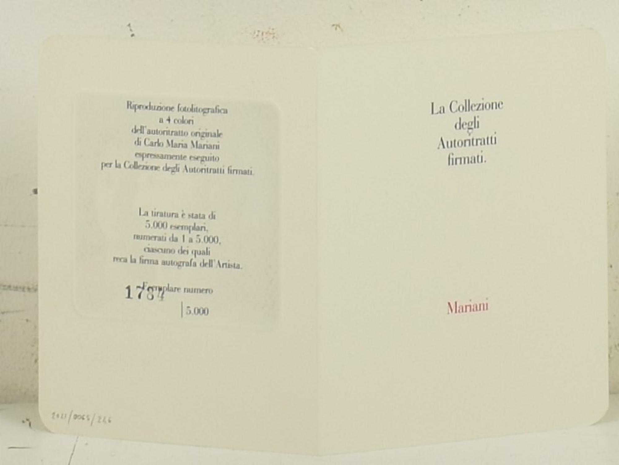 riproduzione fotolitografica a 4 colori dell'autoritratto di Carlo Maria Mariani, cm 8x8, su foglio cm 14x10,5; es. 1784/5000
