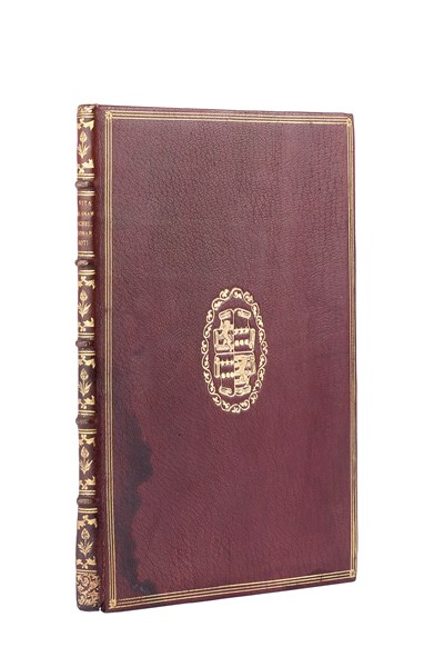 8vo (215 x 154mm). Title within an elaborate woodcut border with a view of the city of Florence, woodcut full-page portrait of the author, printer's device at the end, initials and woodcut headpieces (slight dampstaining at inner margin). 20th-century red morocco with gilt arms, modern endpapers, decorated in gold on plates, spine, edges and inlays (some dampstaining at foot of spine where the rear joint is splitting); preserved in a uniform red morocco case. Provenance: modern exlibris.