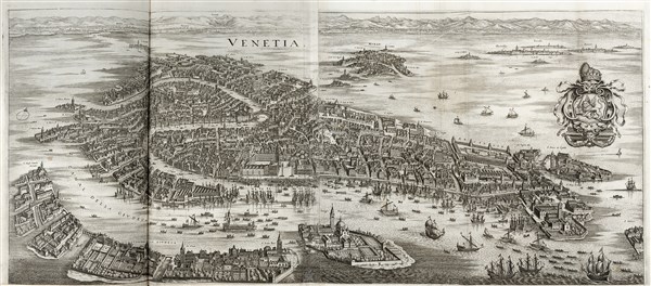 Folio(340 x 202mm). Antiporta incisa in rame da Sandrart, frontespizio con vignetta xilografica, fregi e iniziali incise in legno, 52 tavole incise in rame incluse due splendide vedute di grande formato e ripiegate di Venezia e Roma a volo d'uccello. SBN segnala 52 tavole come in questa copia, mentre una copia venduta recentemente ne aveva 53 con in più quella con "Parte del Golfo di Coron et Messeniacus" (piccolo strappo riparato senza perdita in basso all'antiporta e frontespizio, la veduta di Roma rinforzata al margine superiore e con alcuni piccoli strappetti riparati, veduta di Piazza San Marco con rinforzo al margine e piccolo strappetto riparato, alcuni altri sporadici strappetti o piccole macchie). Pelle coeva, dorso decorato in oro e filetto dorato ai piatti, tagli a spruzzo rossi (reindorsata preservando dorso originale).