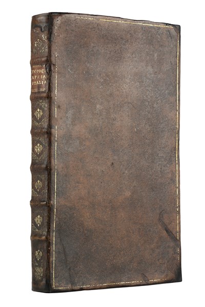 Folio (340 x 202mm). Engraved frontispiece by Sandrart, title with woodcut vignette, woodcut headpieces and initials, 52 engraved plates including two splendid large-format and folding bird's-eye views of Venice and Rome. SBN calls for 52 plates but we recently sold a copy with 53 which also included a view titled "Parte del Golfo di Coron et Messeniacus" (small repaired tear to bottom of engraved frontispiece and title without loss, large view of Rome reinforced at top margin and with few repaired tears, view of Piazza San Marco reinforced at outer margin with a repaired tear, some other occasionl small tears and stains). Contemporary mottled calf, gilt border on covers, spine gilt, red speckled edges (rebacked preserving original spine).