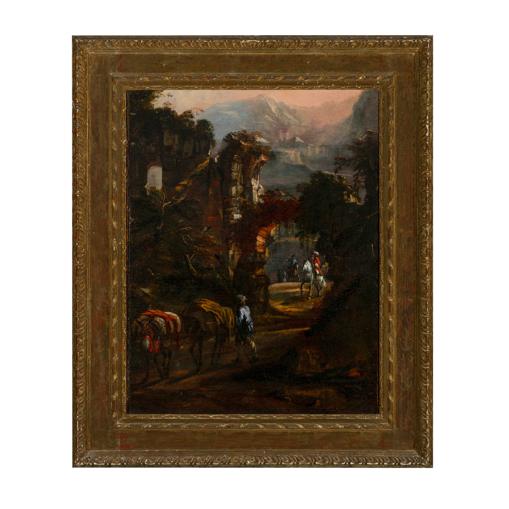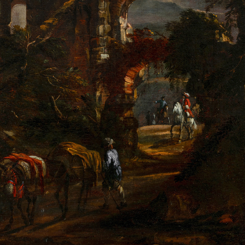 Paesaggio con rovine e cavalieri