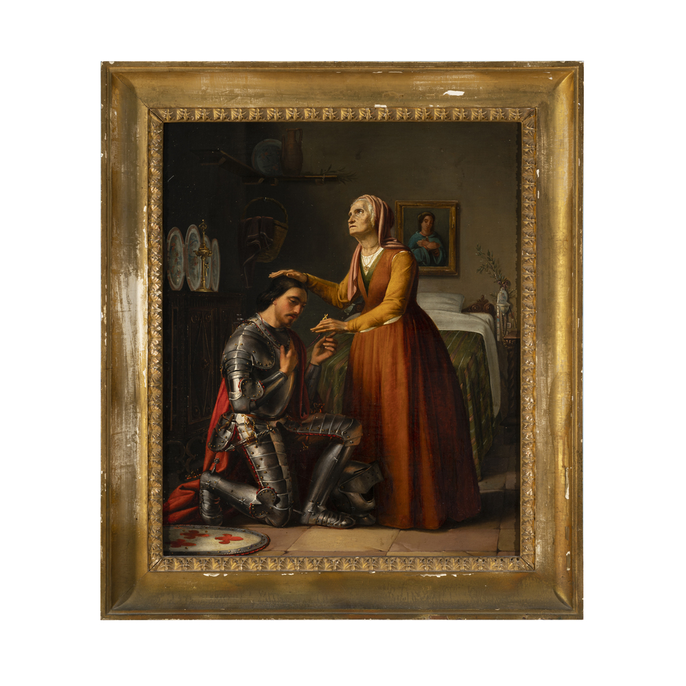 L’opera si avvale di una lettera di Paul Nicholson, pubblicata in risposta ad un quesito dell’allora proprietaria, che recita: Il soggetto rappresentato è un crociato, probabilmente colto nel momento in cui la madre che lo benedice. L'opera rappresenta un paradigma morale tipico della pittura risorgimentale, che nasconde una esortazione agli italiani a ribellarsi contro l'oppressore straniero. Il dipinto potrebbe addirittura identificarsi con l'opera presentata da Giuseppe Mazza all'esposizione di Brera del 1853. Il soggetto ricorda anche il celebre "Addio alla mamma del volontario", preso invece dalla vita contemporanea che Gerolamo Induno dipinse in più versioni: non a caso, forse, poichè i fratelli Induno, come Giuseppe Mazza, erano allievi di Hayez. Per quanto riguarda l'assenza di una firma, va tenuto presente che anche il dipinto esposto a Brera ne è privo: indicato come "di commissione", il pittore ritenne forse fosse superfluo aggiungerla