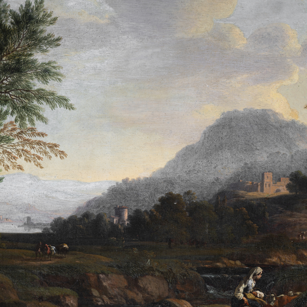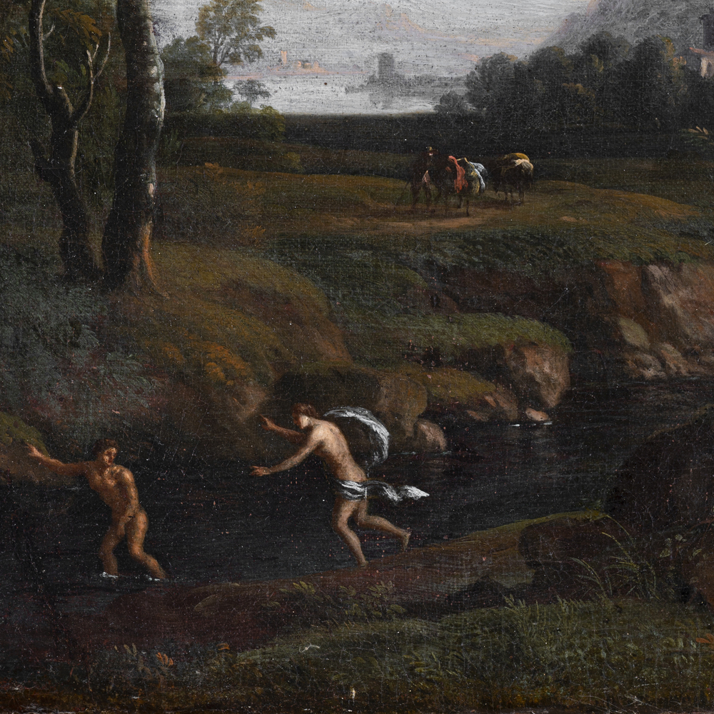 Nato a Roma da padre francese e madre italiana, Gaspard Dughet è tra i più importanti pittori italiani del Seicento, e si trova sul podio del paesaggismo barocco. La sua formazione è merito di Nicolas Poussin, suo cognato, che subito si accorse del suo talento. Giunto alla maturità artistica, l'artista era solito perdersi per la campagna romana per cogliere spunti paesaggistici, senza essere mai stato coinvolto dal fascino delle rovine ivi disseminate. La sua pittura si spiega attraverso l’amore per la natura, il paesaggio laziale e la dimensione favolistica e poetica d’ispirazione arcadica, donata alle sue opere. Egli può essere considerato il nume tutelare di Jan Frans van Bloemen, Andrea Locatelli, Crescenzio Onofri, Johannes Glauber, Albert Meyering: la sua influenza si protrae sino a Marco Ricci. Il dipinto in esame va confrontato con i due paesaggi pubblicati a pagina 534 e 535, appartenenti alla Hazlitt Gallery e National Gallery di Londra, in "Pittori di paesaggio del Seicento a Roma" Volume II, a cura di Luigi Salerno. Molti punti di contatto facilmente riscontrabili, a partire dalla veduta della cittadina di Ariccia presente nelle tre tele. Inoltre, è evidente come il nostro smilzo albero a sinistra, con qualche foglia in più, sia pressochè identico ai due presenti nelle tele londinesi. Infine dettaglio inequivocabile la presenza, in controparte, nella tela della National Gallery del nostro Apollo in veste di personaggio all'antica, assieme a altre due figure sedute a terra