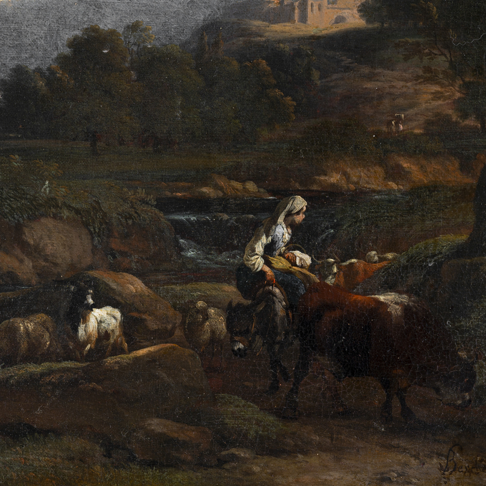 Paesaggio con pastorella e scena mitologica con Apollo e Dafne, veduta di Ariccia sullo sfondo