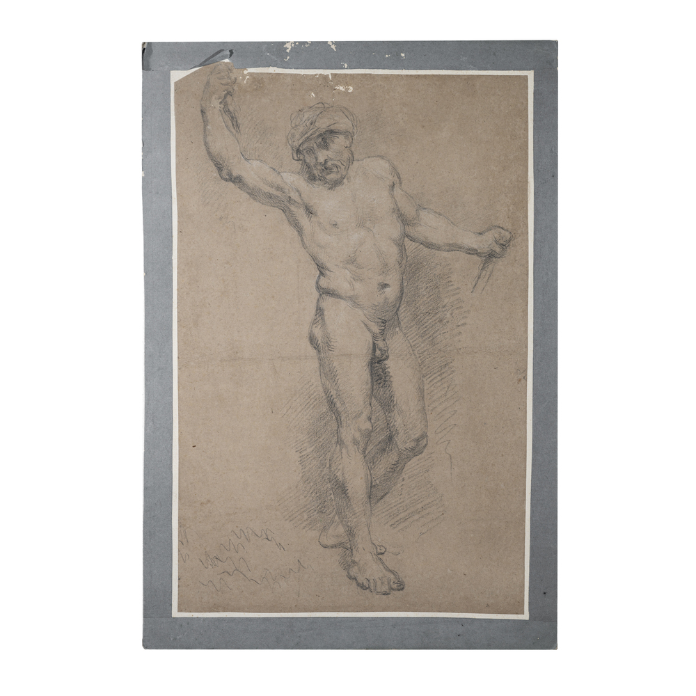 Nella produzione grafica di Giovanni Battista Merano si riflette la complessa stratificazione culturale del suo linguaggio. Alla formazione in Liguria, presso Giovanni Andrea De Ferrari e Giulio Benso, si affiancò presto l’influenza degli emiliani e del classicismo di matrice correggesca, conosciuti nel corso di un precoce soggiorno a Parma (città nella quale lavorò a più riprese anche negli anni successivi). Il segno libero e pittorico, memore del Grechetto, spesso si fa più definito per descrivere anatomie possenti ma al tempo stesso morbide, come nel Bacco della collezione Cooper Hewitt di New York, che condivide con il foglio qui presentato l’approccio monumentale all’esercitazione sul modello