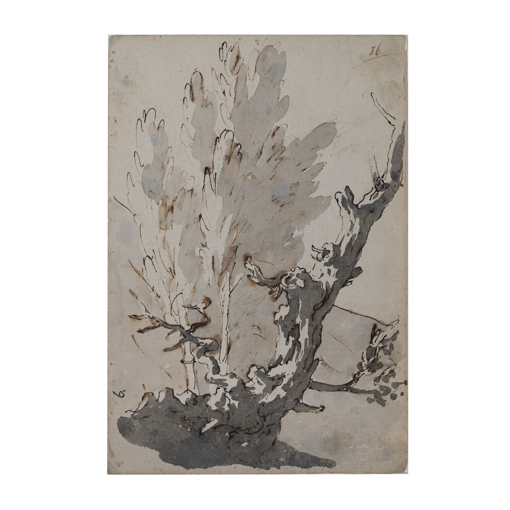 Questo bellissimo disegno richiama gli undici fogli tiepoleschi di soggetto analogo, conservati al Museo Sartorio di Trieste, che la critica ha collocato negli anni 1735-1740 in base a corrispondenze morfologiche con opere di quel periodo (Giulia Bigazzi, Giambattista Tiepolo, i disegni con alberi della collezione Sartorio: datazioni, fonti visive e confronti, in “AFAT”, 35, 2016, pp. 95-110; Giambattista Tiepolo. Disegni. Opere dai Civici musei di Trieste, catalogo della mostra, Ljubljana 2017). Tronchi contorti sottolineati da ombre profonde, e pioppi leggeri appena toccati dall’acquerello, che somigliano alla vegetazione che fa da sfondo alle incisioni realizzate da Tiepolo tra il 1743 e il 1757, poi raccolte sotto il titolo Scherzi di fantasia: si vedano ad esempio i Due maghi con un bambino (tav. 22); una natura simile a quella che prospera in dipinti di datazione tarda, come il Diana e Atteone di collezione Bührle a Zurigo. A spingere in avanti la cronologia del disegno in questione è anche la tecnica, con l'uso dell’acquerello grigio che sarà poi largamente utilizzato da Giandomenico, figlio dell’artista e suo principale collaboratore