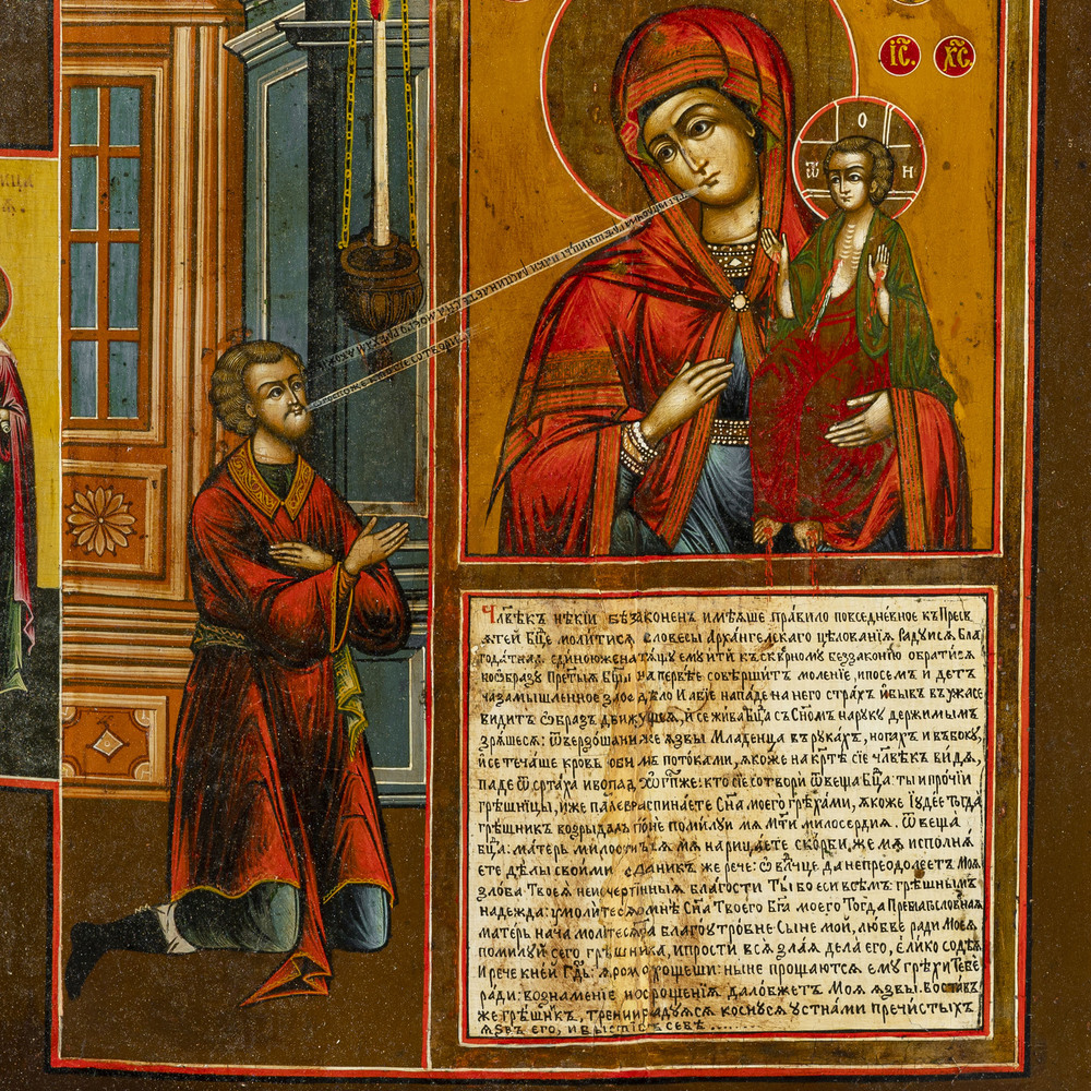 Grande icona, probabilmente destinata al culto pubblico, raffigurante un episodio miracoloso della Vergine che salva dalla perdizione un giovane ladro. In questa rappresentazione vengono sovvertite tutte le principali regole dell’iconografia classica: il testo appare in modo quasi preponderante sull’immagine; non ci sono più scene di cui si presuppone che lo spettatore ne conosca la piena evoluzione e finalità, ma la narrazione è immediata e quasi fumettistica. La descrizione testuale dell’episodio si trova nel grande cartiglio posto alla base dell’icona, mentre dalla bocca della Vergine e del ladro escono raggi che riportano il dialogo. La scena si svolge all’interno di un grande edificio. La dettagliata descrizione del miracolo trova in questa icona una precisa raffigurazione del fatto reso con buona tecnica esecutiva ed eleganza formale