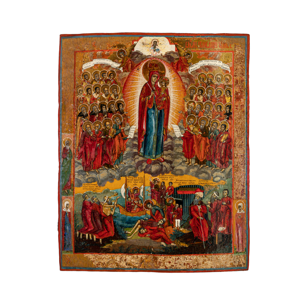La grande tavola raffigura una delle immagini mariane più venerate dalla popolazione soprattutto nel XIX secolo. Lo schema iconografico è qui ampliato con la presenza in basso di due episodi in cui l'intercessione della Vergine ha portato al compiersi di miracoli salvifici. Interessante sottolineare la matrice moscovita dell'immagine della Madre di Dio, poiché tiene in braccio il Cristo Bambino ed entrambi sono coronati. Altra variazione del tema è la sostituzione degli afflitti con due schiere di Santi che si assiepano intorno alla mandorla rosata segnata da raggi luminosi che circonda la Madonna. Di grande effetto scenico e di complessa lettura iconografica, quest'icona si caratterizza per una cromia intensa e brillante, che si staglia su un fondo oro caldo e profondo: elementi stilistici che portano ad inserirla nelle migliori produzioni delle scuole iconografiche della Russia sud-occidentale