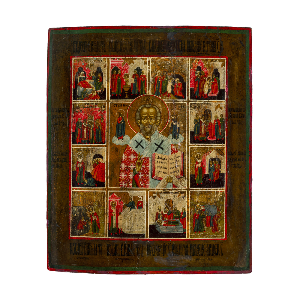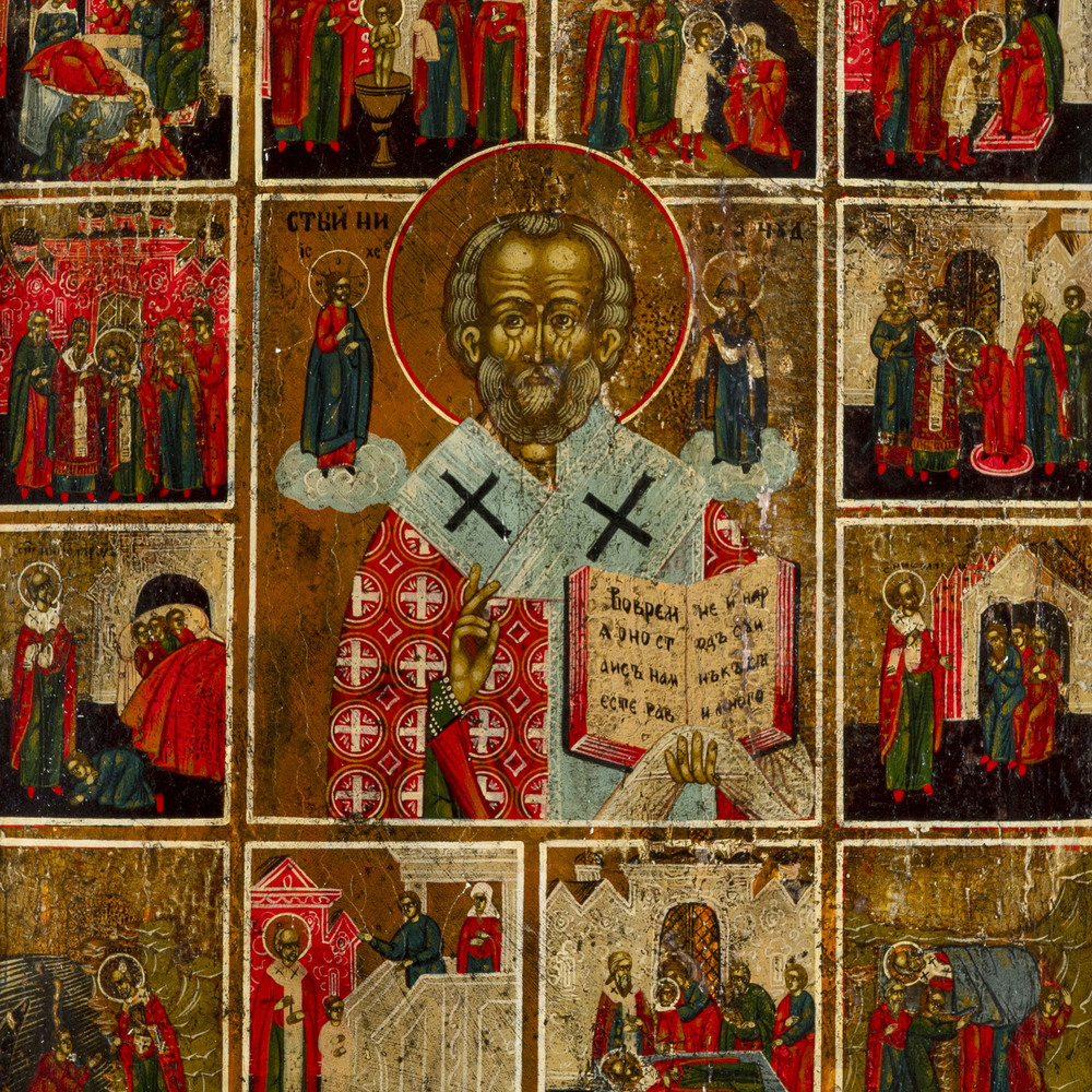 Tavola che riprende l'iconografia più antica, giunta dall'arte bizantina, rappresenta S. Nicola a mezzo busto attorniato da scene della vita. Il numero e la scelta degli episodi possono variare, ma rimane sempre fissa la struttura principale che comprende alcuni momenti della vita: i miracoli più importanti, la morte e la traslazione delle reliquie. Sin dall'antichità, questa tipologia di icone era di grandi dimensioni e destinata alle chiese. Questa icona mostra caratteristiche stilistiche tipiche delle produzioni della Russia centrale: di particolare effetto è il manto rosso di Nicola, ornato dalle croci racchiuse in tondi e la preziosità dei palazzi che fanno da sfondo alle scene della vita