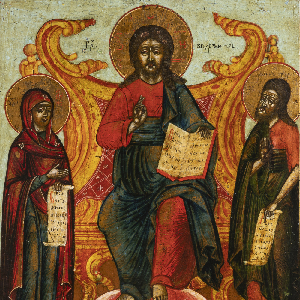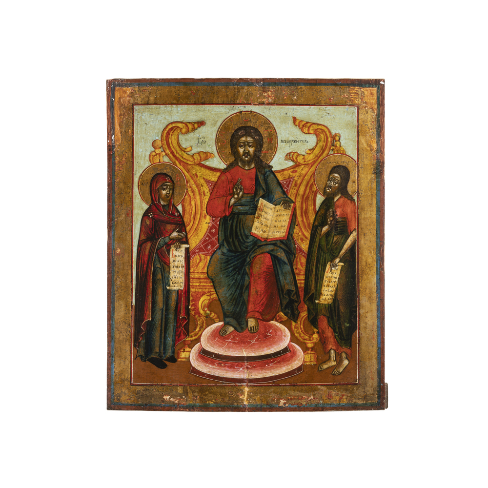 Icona di famiglia, con Cristo in trono affiancato dalla Madre di Dio e da San Giovanni Battista. Gesù siede su un ricco ed elegante trono barocco, che poggia su un piedistallo a gradoni, mentre le vesti sono decorate con sottili crisografie. Risultano ancora ben leggibili i versetti sui cartigli