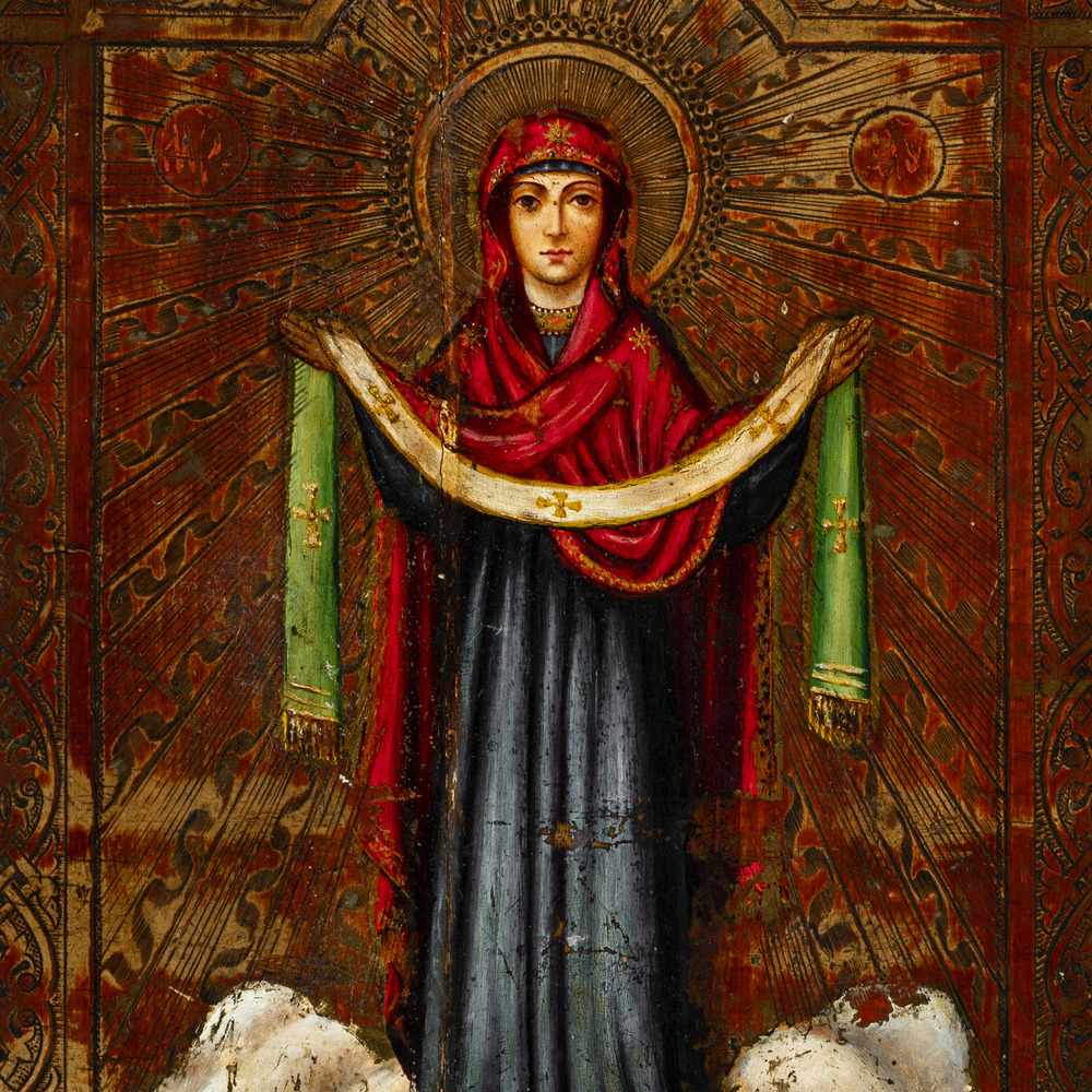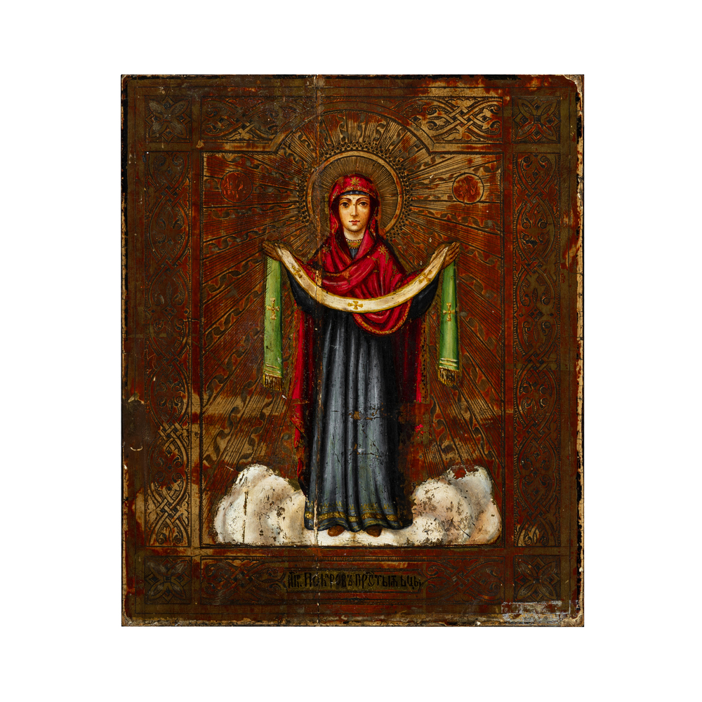 La tavola in questione raffigura, sinteticamente, la Madre di Dio di Pokrov, canalizzando l'attenzione del tema sulla protezione della Vergine: la Madonna, sola, poggia i piedi sulle nuvole e stende un velo sull'umanità. Scelta iconografica di grande suggestione, l'icona amplifica il senso del Divino con il fondo oro (solo in parte conservato), che ricorda i raggi della mandorla in cui è racchiusa la Madre di Dio, con la caratteristica decorazione del bordo che richiama le lavorazioni a smalto dell'epoca. La preziosità di questa piccola opera è ulteriormente sottolineata dall'uso del legno di cedro come supporto ligneo, che era destinato alle icone più ricche