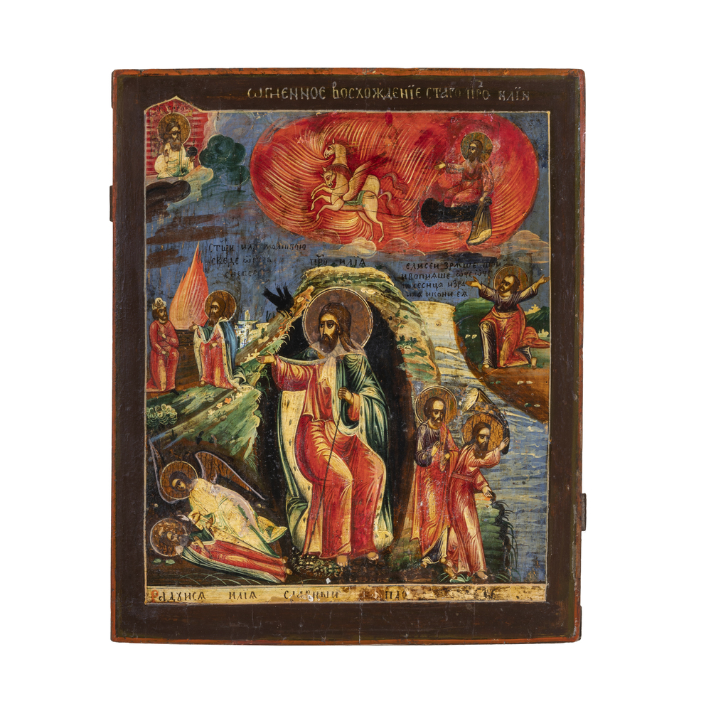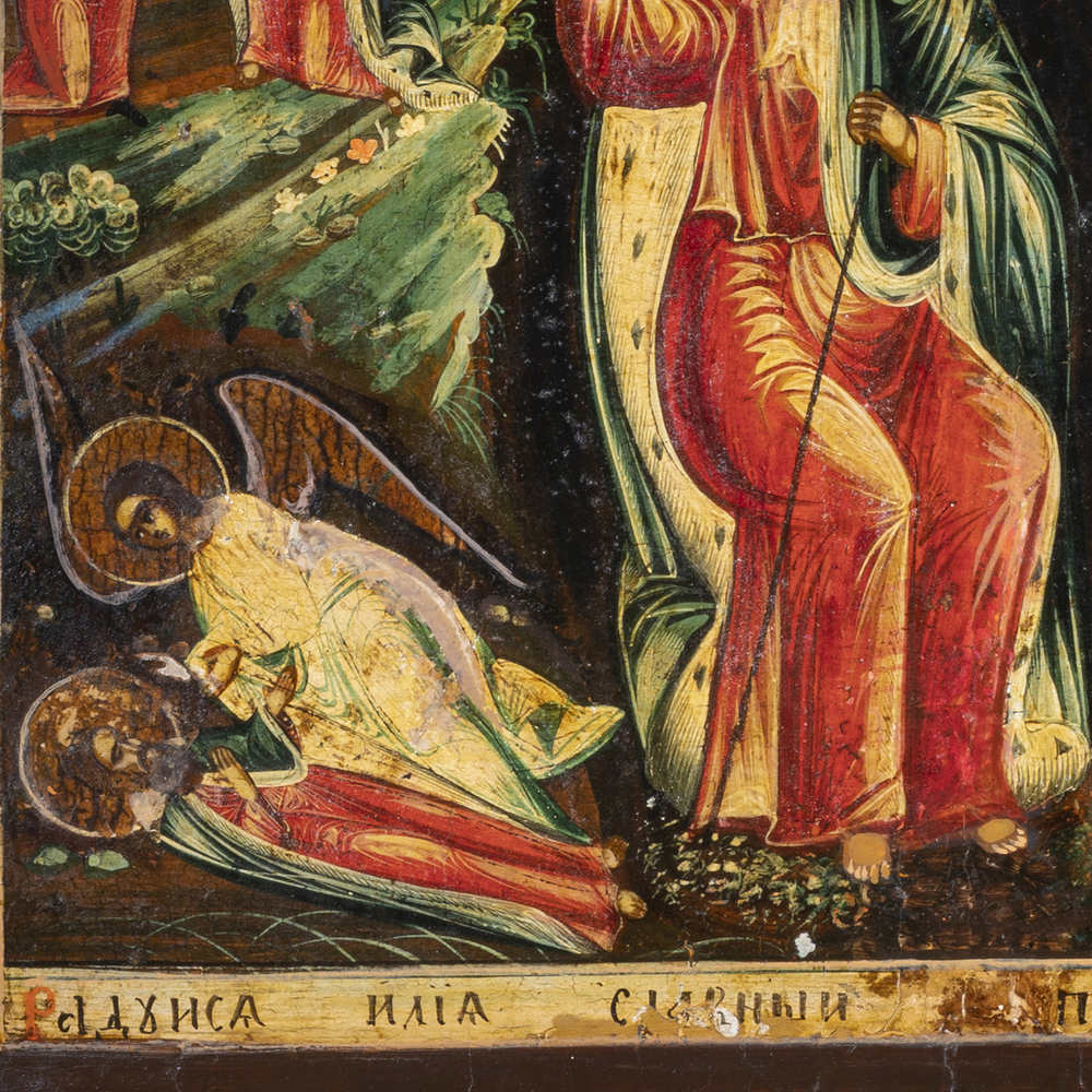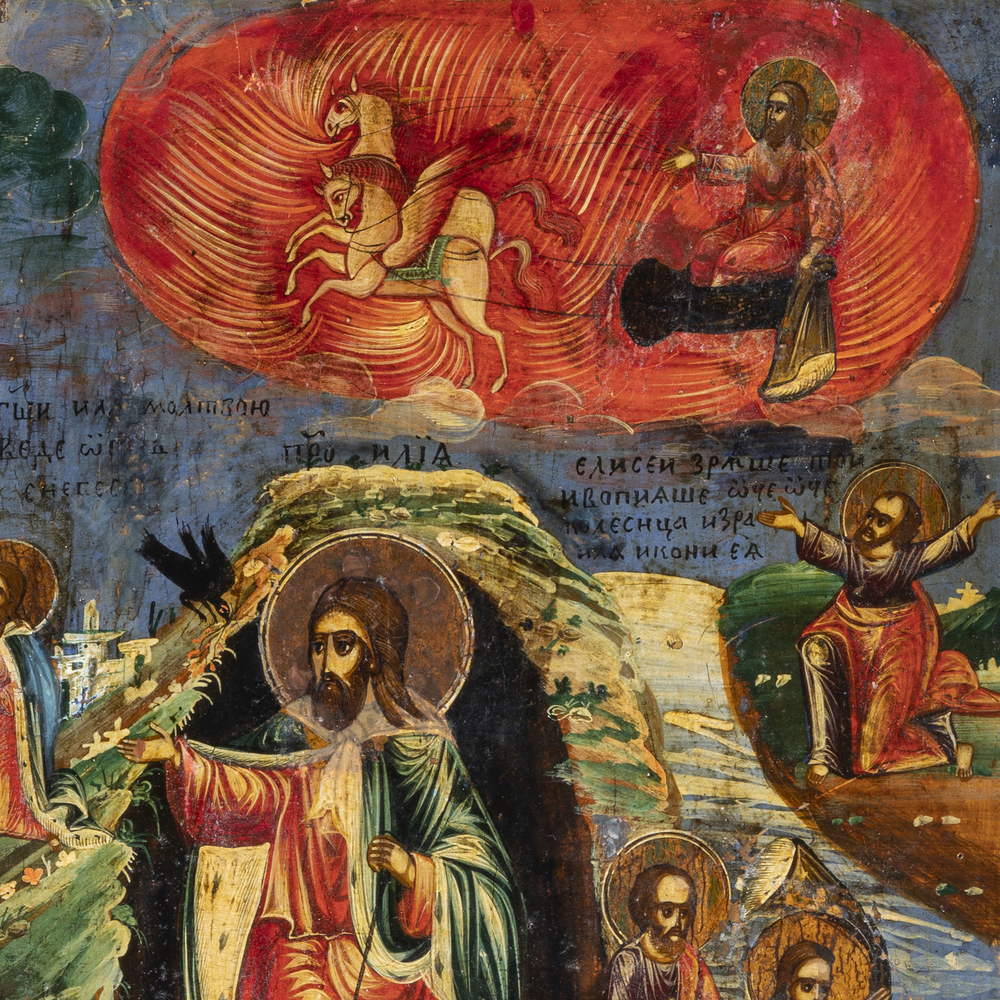 Questa grande icona narra le storie della vita del Profeta Elia: ricca di dettagli e descrizioni, la tavola si caratterizza per una cromia giocata sul contrasto tra il rosso e il blu, su cui spiccano le pennellate quasi bianche che illuminano i visi e alcuni particolari