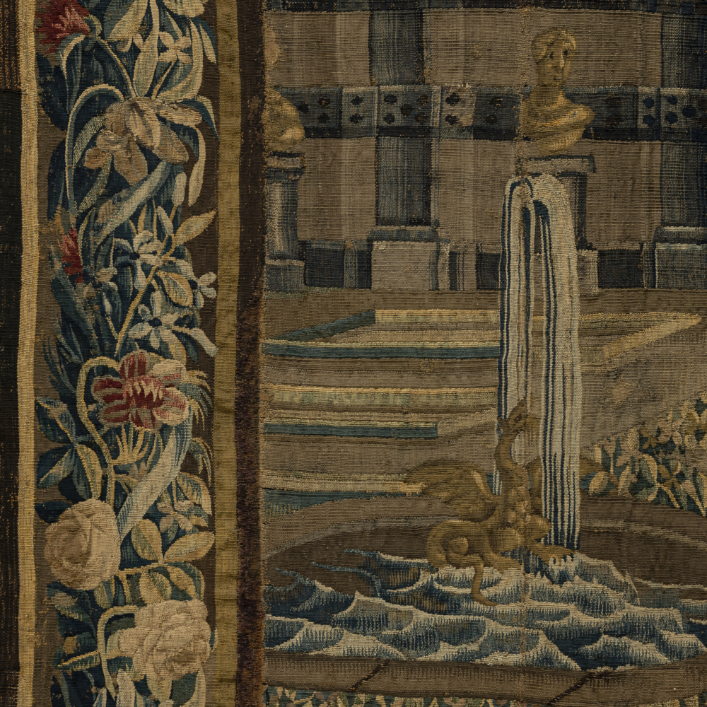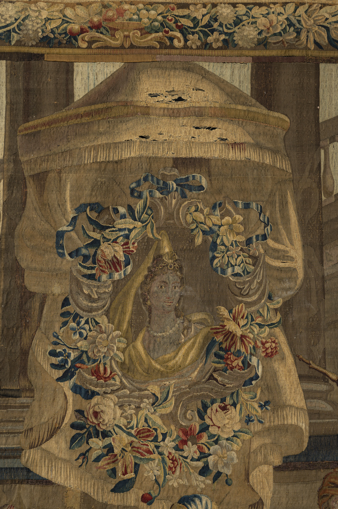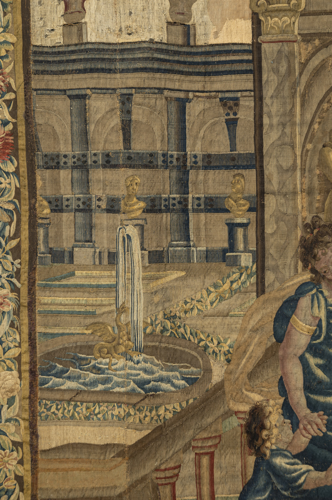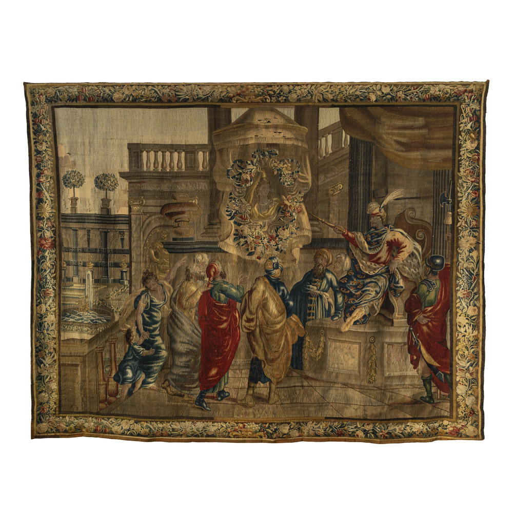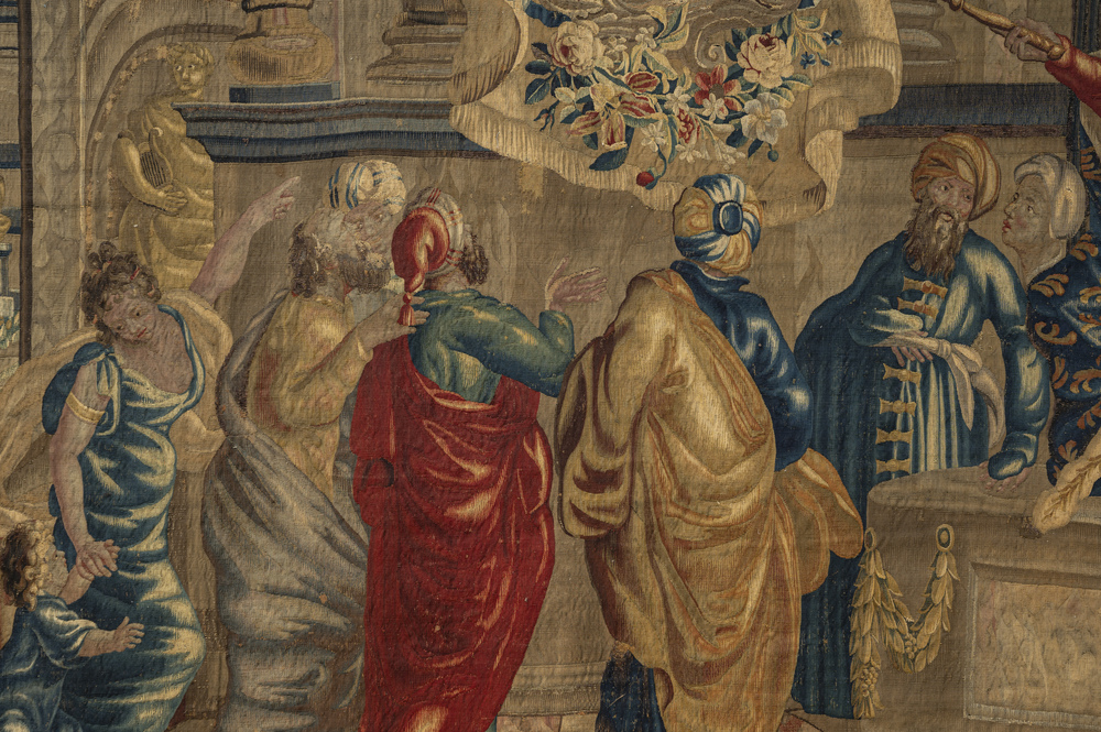 La scena rappresentata è un vero rebus interpretativo e probabilmente si riferisce al sovrano romanzo epico tardo medievale spagnolo dedicato all'amore di Amadigi di Gaula e Oriana. Un sovrano orientale mostra ai sudditi una donna ritratta su un baldacchino che appare in cielo. La scena non è di facile lettura, e si potrebbe intendere in senso puntuale (illustra un probabile episodio di un romanzo in cui miracolosamente avviene quanto si vede) oppure in senso simbolico (la scena vuole dirci che il sovrano sta parlando di quella donna e la sta magnificando). Attorno al 1700 l'arazziere olandese Alexander I Baert ha tessuto almeno due volte una serie della "Storia di Amadis", variante barocca francese del romanzo epico tardo medievale spagnolo “Storie di Amadis”, che ha avuto nei secoli vari rifacimenti, tra cui l'Amadigi di Torquato Tasso. Una serie di Amadigi e Oriana era già stata tessuta in Olanda alla fine del '500. Due arazzi sono al Poldi Pezzoli di Milano. Nella successiva serie, realizzata da Baert, il testo seguito fu quello dell'opera teatrale francese Amadis, scritta nella Parigi del tempo di Luigi XIV da Quinault, musicato da Lully. La serie fu tessuta sulla base di cartoni che chiaramente spettano, per la parte delle figure, al fiammingo Lodewijk van Schoor; un gruppo di quattro arazzi è a Bayreuth, Neues Schloss, pubblicati da S. Heym, "Amadis und Oriane. Im Zauberreich der barocken Oper. Tapisserien im Neuen Scloss Bayreuth", 1998; un altro gruppo di cinque arazzi con scene in parte diverse è passato in asta a New York, Parke-Bernet Galleries nel 1956. Lo stile di questi arazzi corrisponde perfettamente all’arazzo in oggetto, come anche le bordure, solo un poco più strette. Si può ipotizzare che si tratti di una terza tessitura operata da Baert, sulla base del fatto che il soggetto non compare a Bayreuth