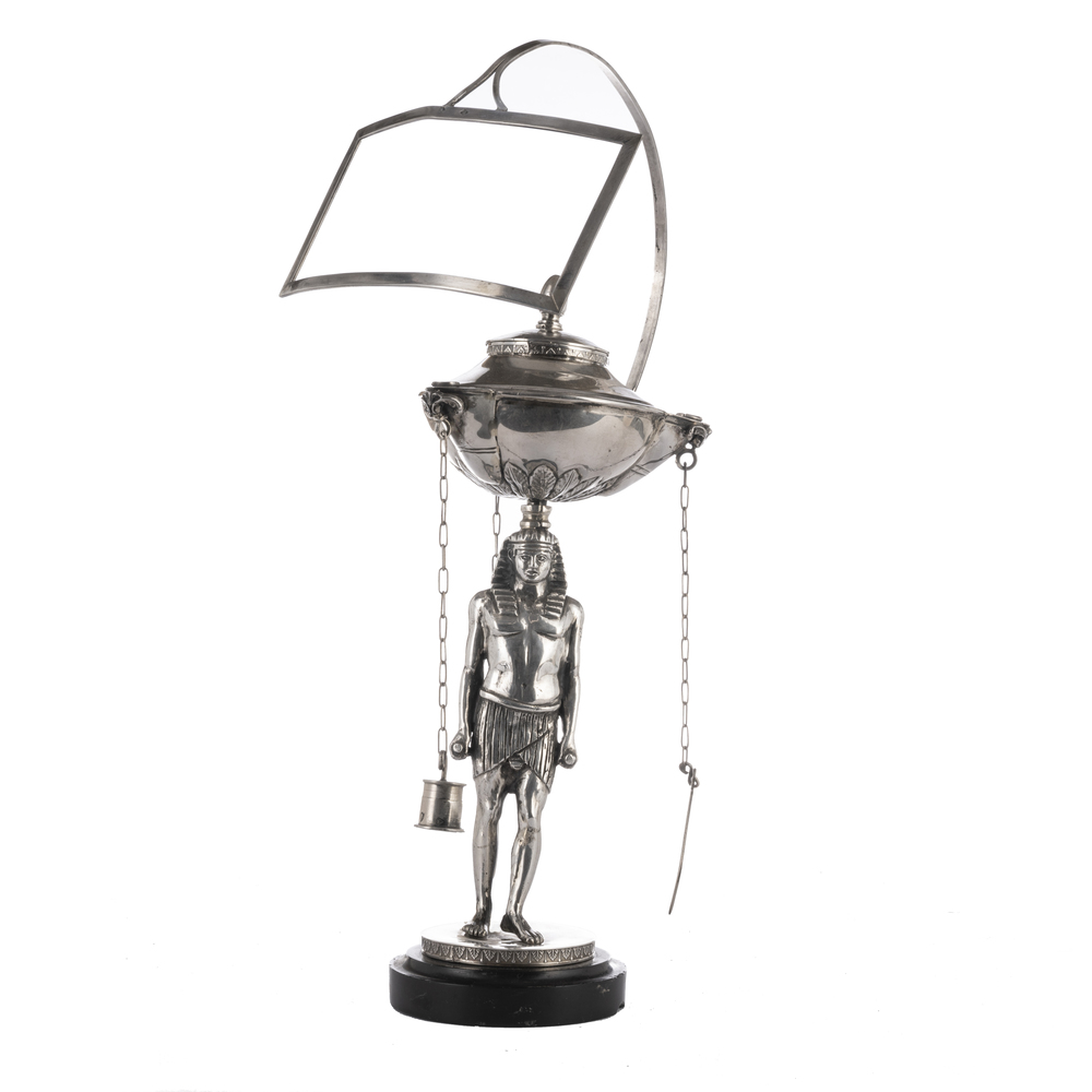 Contenitore porta olio con accessori sostenuti da catenelle e paralume ad innesto