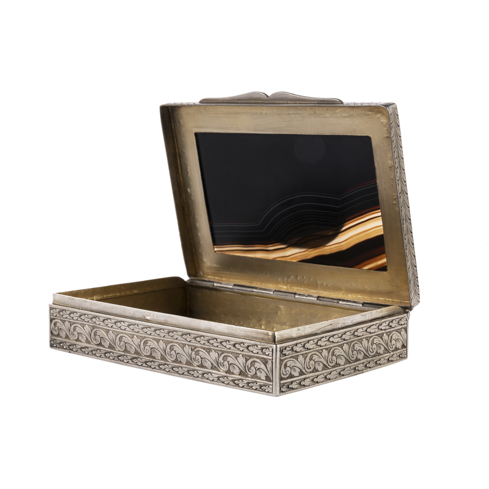 Corpo liscio con bordure lavorate a motivi floreali e girali, coperchio in agata con mosaico applicato